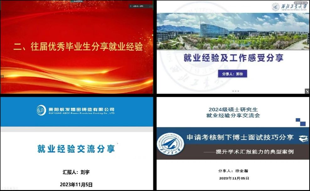 刘宇师兄向大家介绍了贵阳精铸公司的情况,对比国有企业与民营企业的区别,分析不同企业的优势,并根据自身经验分享求职过程的注意事项;最后徐金瀚师兄为大家分享了申请考核制下博士面试的技巧,他提示大家要明白读博的真正意义,清楚职业生涯规划,并为大家详细讲解了读博申请流程,然后以个人的博士研究生申请答辩PPT为模板,为大家做了答辩示例。